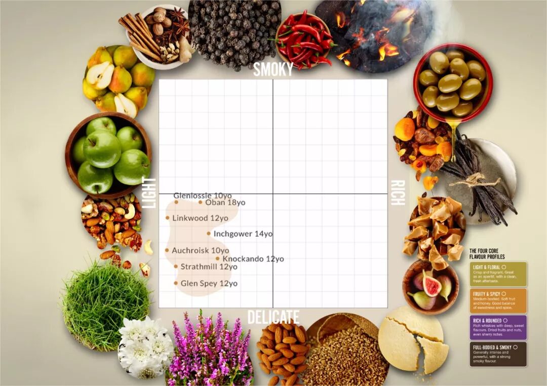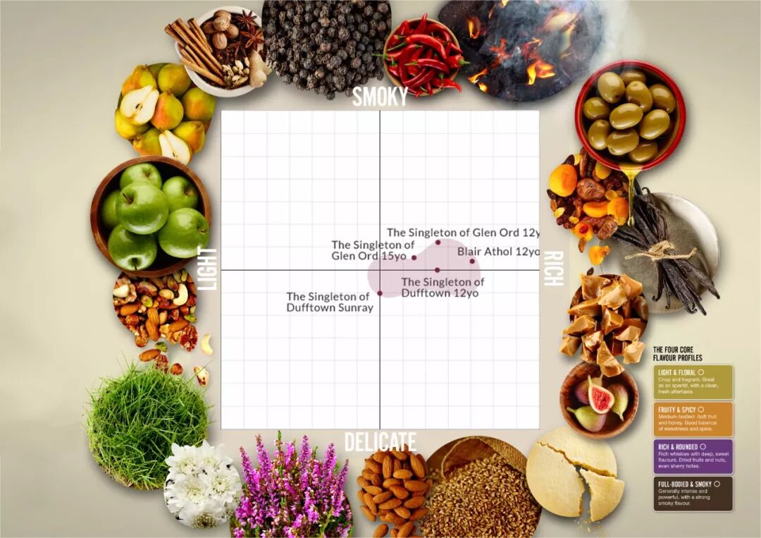这张单麦威士忌风味地图以坐标轴的形式向 4 个方向不断延伸: