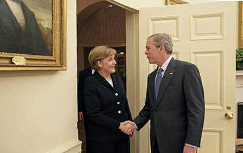 默克尔自上台到现在,与美国的关系经历了各种大起大落。上台后由于公开支持伊拉克战争的关系,默克尔与小布什的关系一直不差。不过,在2008年则发生了一个有趣的新闻。在G8峰会期间,默克尔当时正在会议厅内与意大利总理普罗迪讲话。谁知此时小布什悄悄溜到了默克尔身后,突然伸出双手按到了默克尔的肩膀上,想为她进行按摩。这可吓坏了默克尔,小布什冷不丁的举动令她瞬间举起双手,露出了一脸惊恐的表情,小布什也只好尴尬地收手。