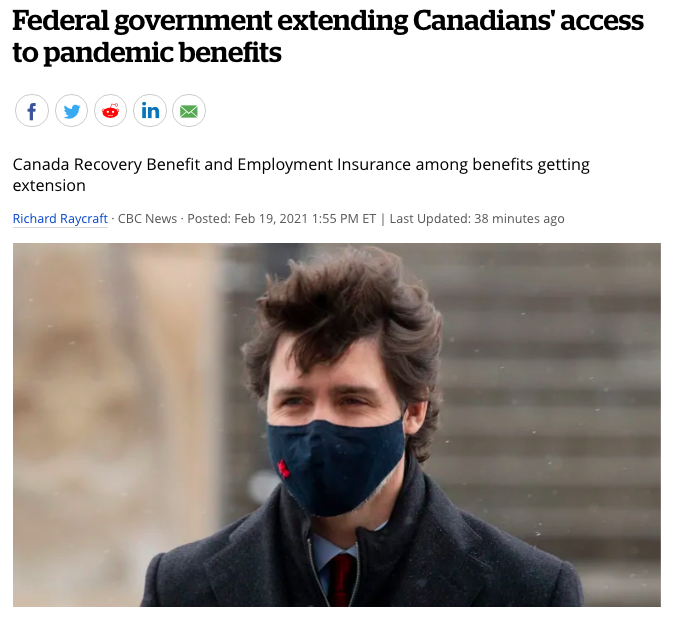2月19日,加拿大总理贾斯汀·特鲁多(Justin Trudeau)宣布,联邦政府将延长发放几项疫情补助的时限。
