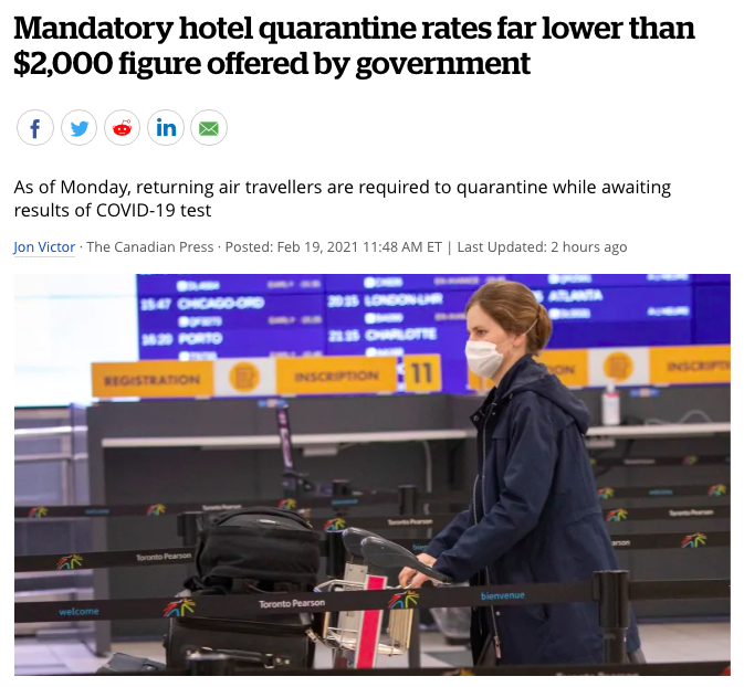 而据CBC News 2月19日报道,为期三天的酒店隔离费用似乎远低于官员们宣布新政时所报2000加币的价格,并没有那么昂贵。