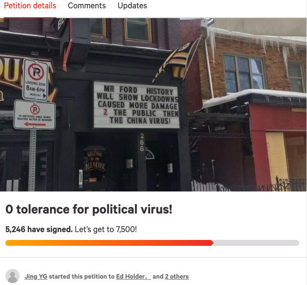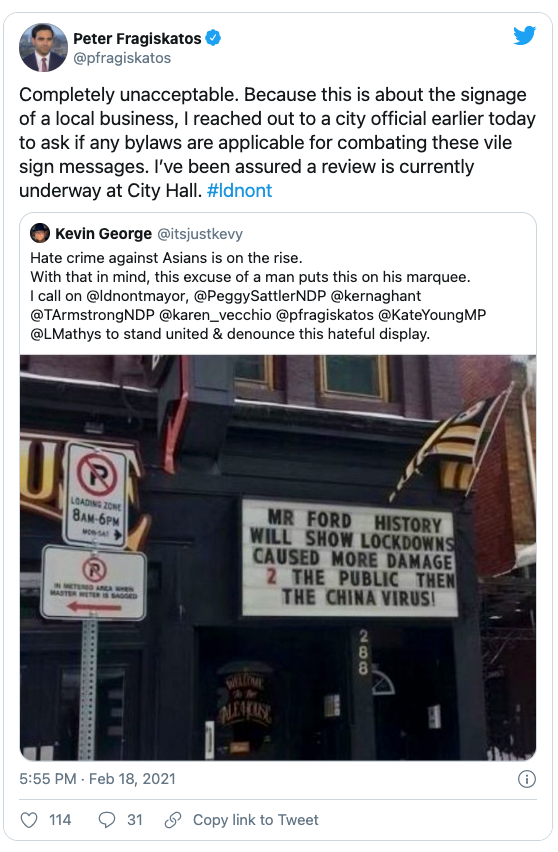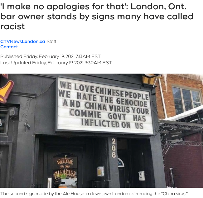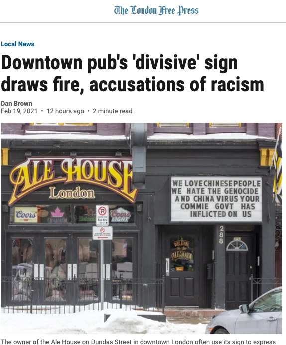 CBC报道称,在本周早些时候,安省伦敦的人们在市中心的一家酒吧看到一个直接针对亚裔社区的歧视标志,于是呼吁采取政治行动。