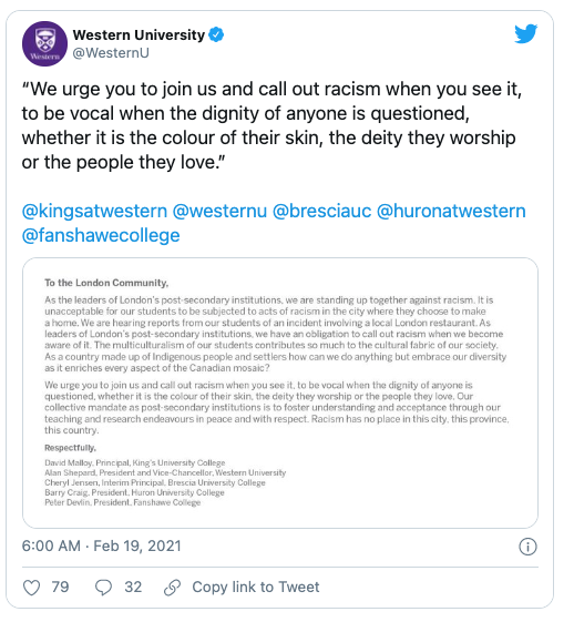 西大在推文中说:“我们敦促伦敦人们加入我们,并在看到种族主义时大声疾呼,当有人的尊严受到质疑时,请大声疾呼…….种族主义在这个城市,安省省、加拿大都没有地位。”