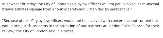 但是,伦敦市政府在周四的一条推文中说,市政官员不会介入,因为市例(bylaw)是从“公共安全和城市设计的角度”处理标牌。