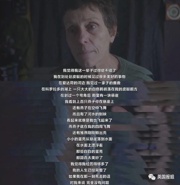 在《无依之地》中,一个70多岁的游牧老太已经身患重病,时日不多,但她对这短暂的一生却十分满足,她描述了这样一个画面: