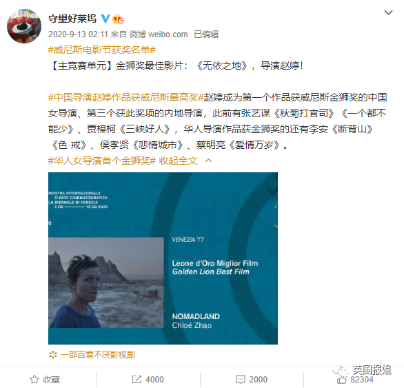 当然目前最令电影人为之振奋的,还是时隔13年继名导李安之后,又一个华人面孔拿下这座威尼斯电影节金狮奖,也是第一位获得该奖项的中国女导演。