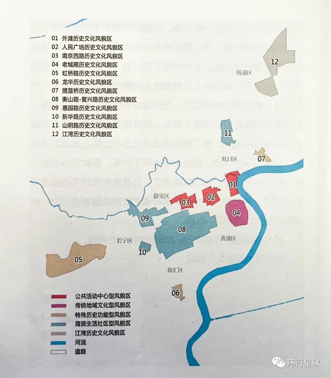 上册中的外滩历史文化风貌区、人民广场历史文化风貌区和南京西路历史文化风貌区属于公共活动中心型风貌区,老城厢历史文化风貌区属于传统地域文化型风貌区,虹桥路历史文化风貌区、龙华历史文化风貌区、提篮桥历史文化风貌区属于特殊历史功能型风貌区。