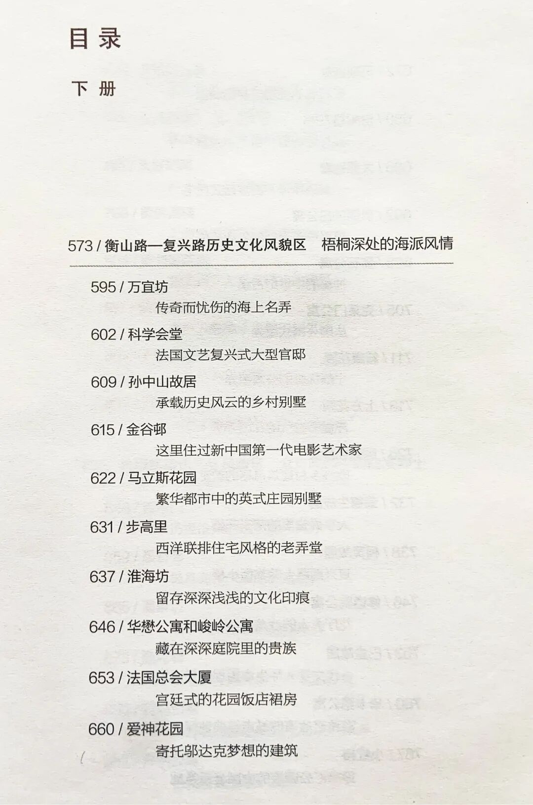 下册中的衡山路—复兴路历史文化风貌区、愚园路历史文化风貌区、新华路历史文化风貌区与山阴路历史文化风貌区则属于海派生活社区型风貌区,再加上江湾历史文化风貌区共同构成了本书的完整轮廓。