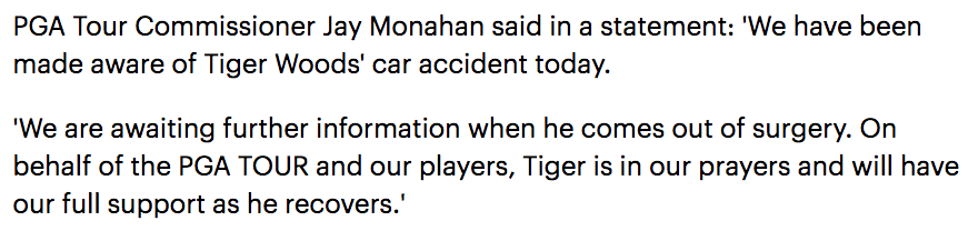 不过主办方在稍后回应媒体询问时的措辞却有点奇怪。PGA方面的组织者Jay Monahan在事发后的声明中说:“我们今天已经收到有关老虎伍兹车祸的消息。我们正在等待他的手术结果以及更多的信息,等他康复时会得到我们的团队的全部支持,为他祈祷。”