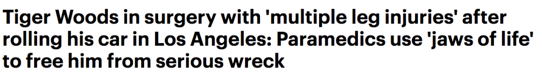 《每日邮报》最新消息称被紧急送医的泰格·伍兹由于腿部多处受伤(multiple leg injuries),包括复合性骨折及踝关节骨折,目前正在进行手术治疗,所幸没有生命危险。不过从警方发布的信息和现场照片来看,车祸现场仅有泰格·伍兹驾驶的一辆车,且车辆经过多次翻滚损毁严重。
