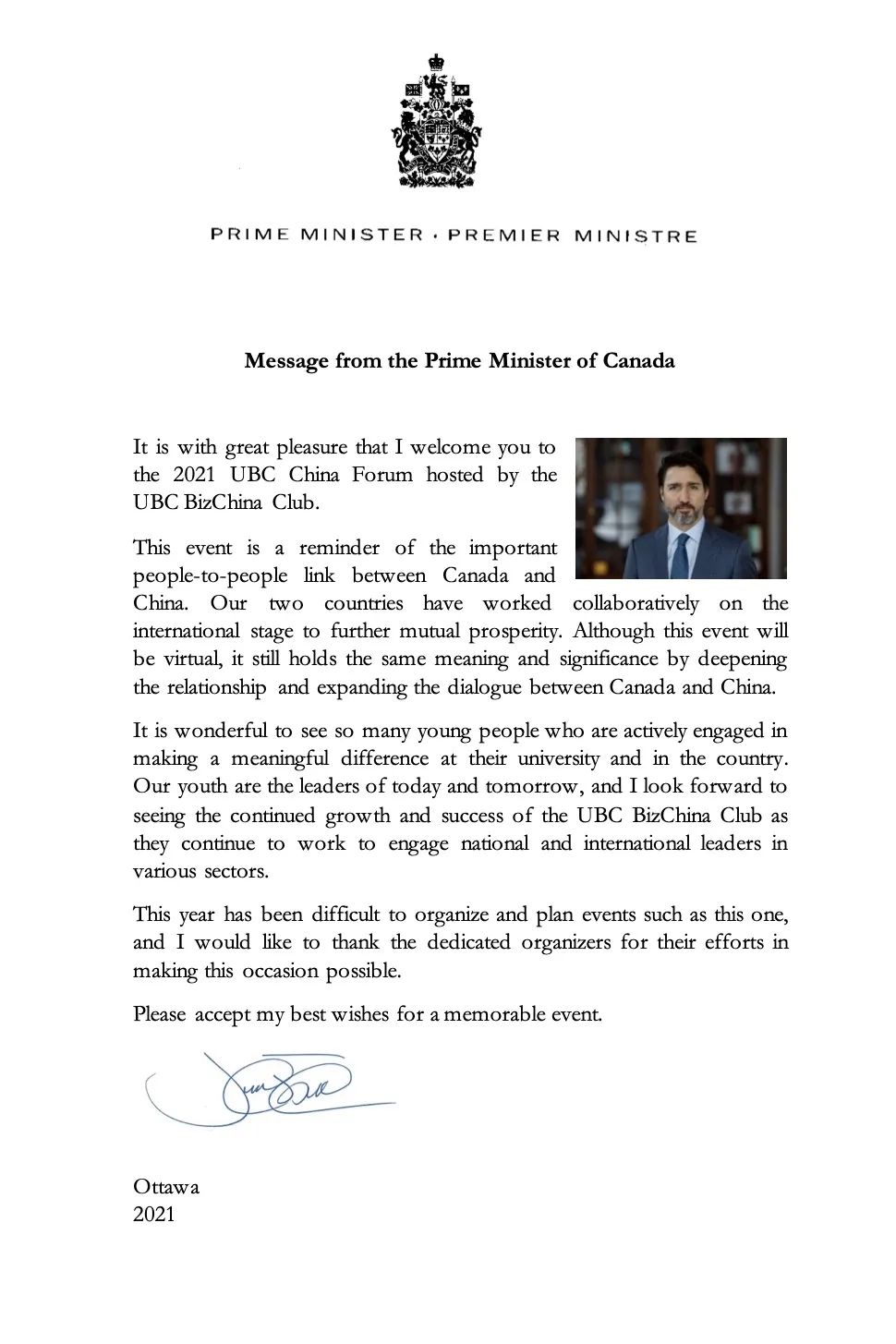 1、加拿大总理贾斯汀特鲁多发来亲笔贺信