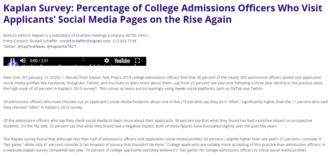 升学服务公司卡普兰(Kaplan Test Prep)2020年1月发布的一项调查显示: