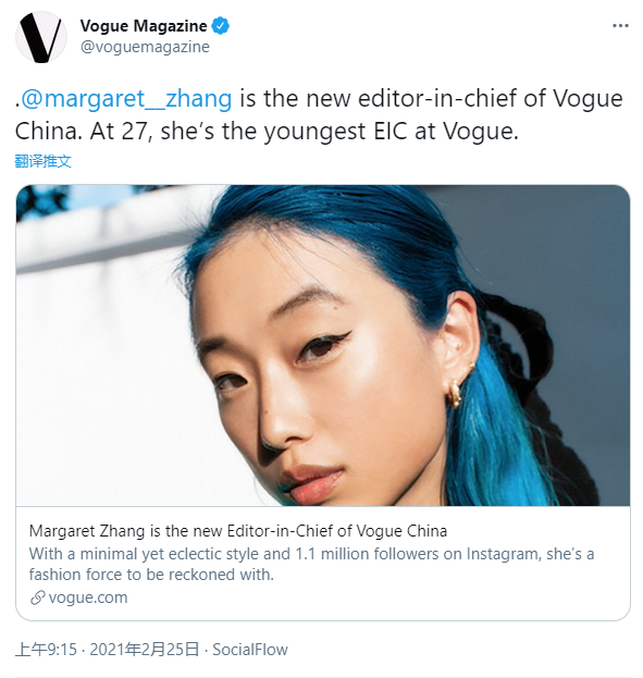 定了!今天上午,康泰纳仕(《VOGUE》杂志的母集团)正式宣布Margaret Zhang将接任张宇成为VOGUE中国版主编。