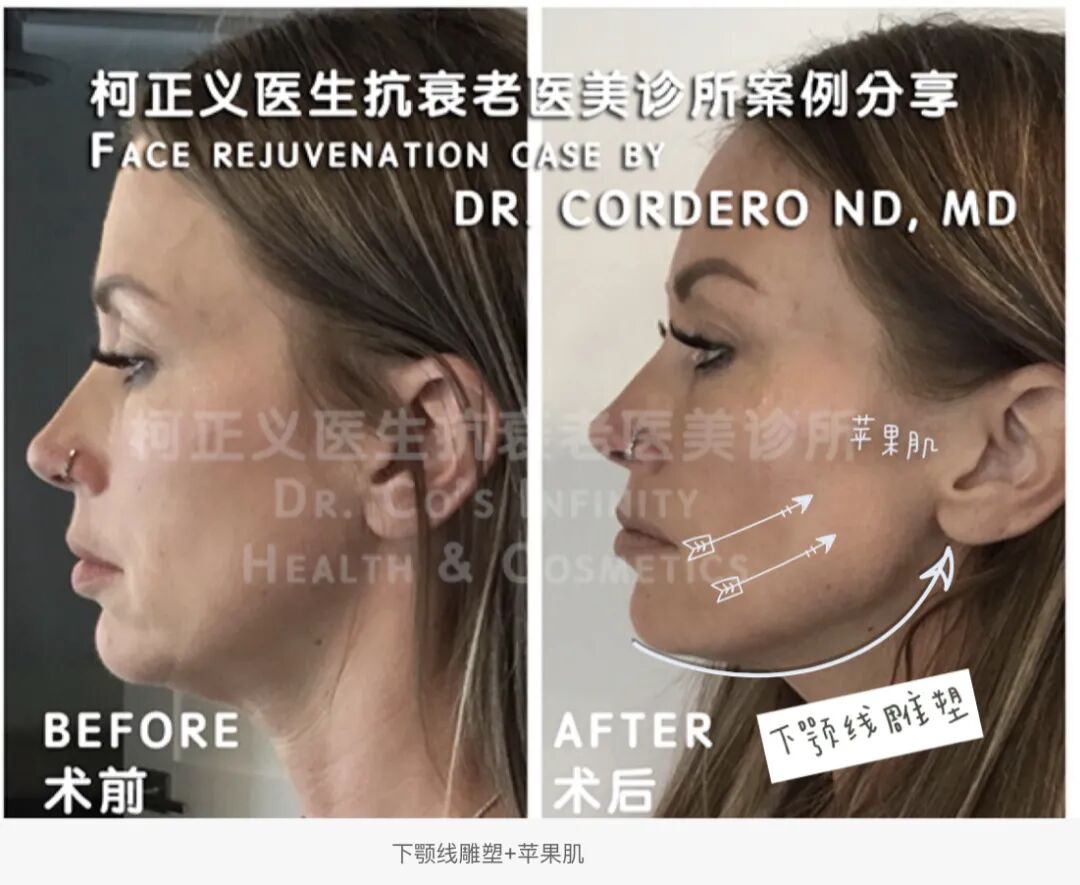 客人下颚线松弛,线条不明显,苹果肌也有下滑的症状。在做了治疗以后,下颚线重获新生,线条明显而又自然;苹果肌也提升了,整张脸显得年轻、紧致、轮廓清晰。