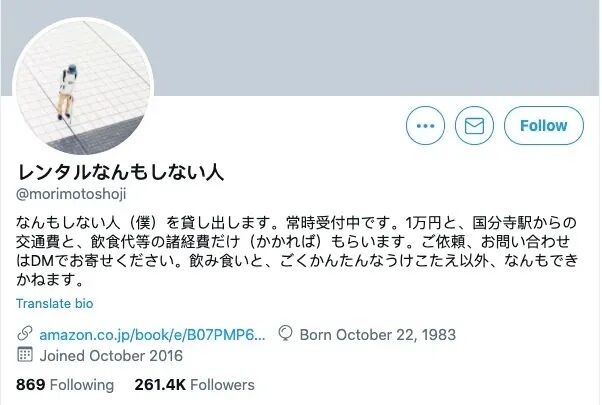 我会租给你一个人(我),但是我啥活也不干。而你则需要支付我1万日元(约612元人民币)的劳务费,以及我的交通费和其他杂费,包括食物跟饮料的费用。 如果有需求,请直接私信咨询。出租期间,我除了吃喝和简单回应之外,什么都不会干的。
