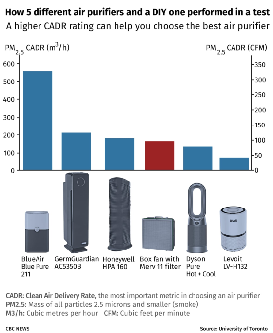 近日,他的团队与CBC联手测试了5款最受欢迎的空气净化器品牌:Levoit LV-H132,GermGuardian AC5350B,Dyson Pure Hot + Cool,BlueAir Blue Pure 211+和Honeywell HPA 160,以及一个用高效滤网自制的简易空气净化器。