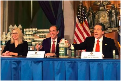 ·科莫(右)在记者会上展示纽约州监狱劳工制造的洗手液。