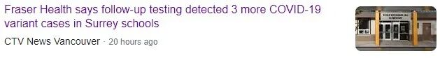 BC省学校已发现10宗变种病毒案例,其中素里9宗,三角洲1宗。涉及学校还包括:Queen Elizabeth 中学, Frank Hurt 中学,M.B. Sanford 学校,AHP Matthew小学,Tamanawis中学,Gobind Savar小学,James Ardiel小学和三角洲的Hellings小学。