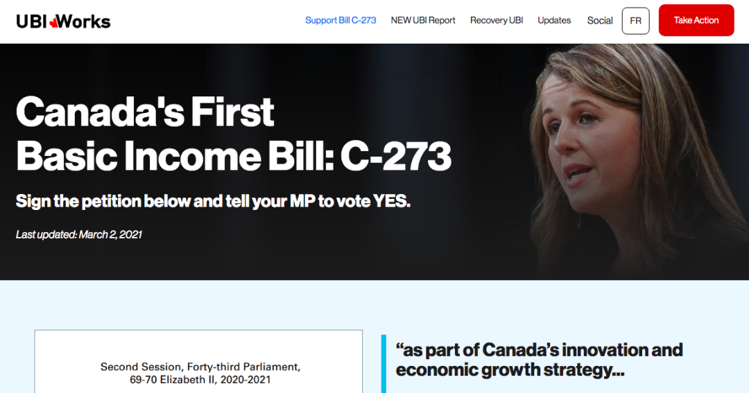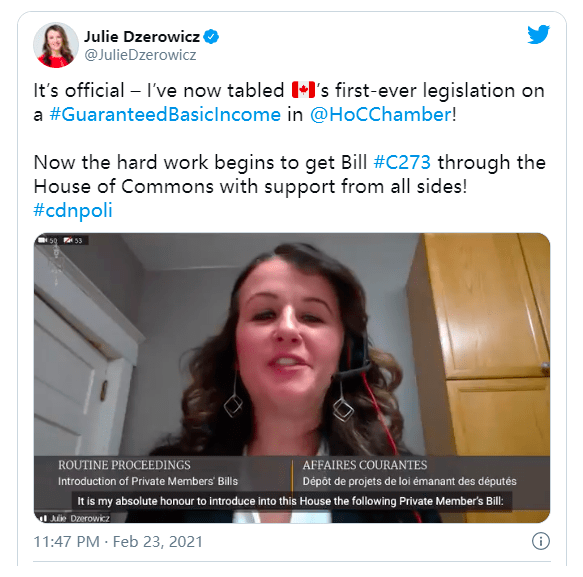 2月22日,她提出了一项C-273法案,该法案呼吁联邦财政部长研究基本收入保障模式,并制定一项全国性战略,以评估加拿大如何实施该计划。