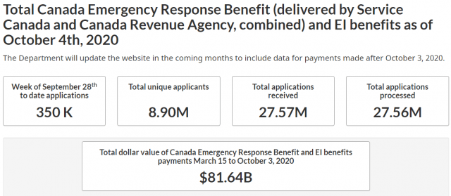 而政府数据显示,疫情大流行期间,加拿大税收署(Canada Revenue Agency)和就业保险系统(Employment Insurance system)通过两个项目双管齐下,从2020年3月15日至10月3日期间,向890万人共发放了高达816亿加元的补助金。