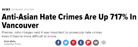 以BC省为例,温哥华警方2月发布的数据显示,自去年3月以来,针对亚裔的仇恨犯罪增加了717%,BC省省长贺谨(John)更是严肃地表示,起诉仇恨犯罪将是省政府的首要任务。但《赫芬顿邮报》评论称,通常情况下仇恨犯罪很难被起诉,因为诸多种族歧视案件,虽然性质恶劣,但还达不到刑事犯罪的标准。