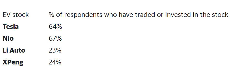 Benzinga本月对1000多名读者进行了调查,了解他们投资热门电动车股票的情况。调查显示,在过去的一年里,有67%的受访者投资了蔚来股票,有64%的受访者投资了特斯拉股票,有24%的受访者投资了小鹏汽车股票,有23%的受访者投资了理想汽车股票。蔚来比“网红公司”特斯拉还要受追捧。