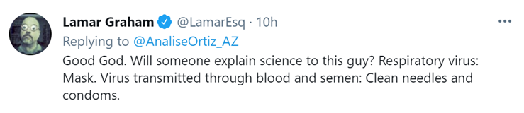 “我的天啊。能来个人向他解释下科学问题吗?呼吸道病毒,就戴口罩预防;通过血液和精液传播的病毒,就使用干净的针管和避孕套。”