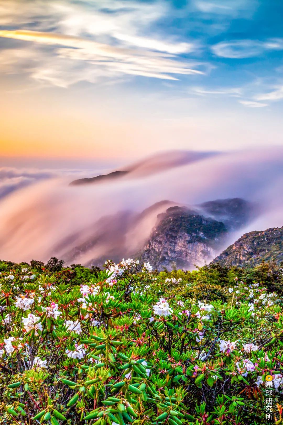 “奇花烂熳半天中,天上云霞相映红”