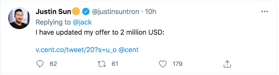 一位名叫杰克·多西的人正在出售他的第一条推文,目前竞价已超千万!