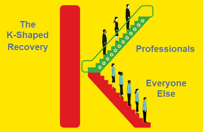 这些因素都是相关的。但是,这些因素都不能完全解释为什么疫情会造成租金和房价之间前所未有的脱节。要理解这种分歧,首先要理解我们 “K型 “经济的更广泛的分歧,其中K代表了大流行期间富人和穷人的分叉命运。餐馆和实体店的许多小时工受到了工资损失和失业的严重打击,而科技和金融等白领行业的数百万知识工作者则通过呆在家里(并持续地呆在家里)度过这场大流行。他们用大量的网上房地产购物来缓解他们的小屋焦虑。