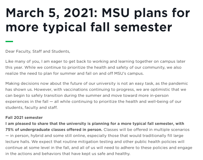 密歇根州立大学表示“随着疫苗接种的持续发展,我们乐观地认为,我们可以在夏季开始安全过渡,并在秋季转向更多的面对面授课体验——所有这一切都将继续优先考虑我们的学生、教师和工作人员的健康和福祉。大学正在计划在秋季学期提供75%的面授课本科课程,此外课程将以多种形式提供——面对面的,混合的,课程人数较多的课程还保持在线。学校将为一年级学生和尽可能多的其他学生提供宿舍体验,同时提供安全的生活空间。”