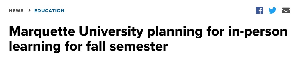 综排88名的马凯特大学宣布计划在2021年秋季学期提供现场学习和生活。大学校长Michael R. Lovell在写给社区的一封信中写道,虽然计划的细节将在稍后公布,但Michael R. Lovell希望学生和教职员工知道,校园生活将在今年秋天开始恢复正常。