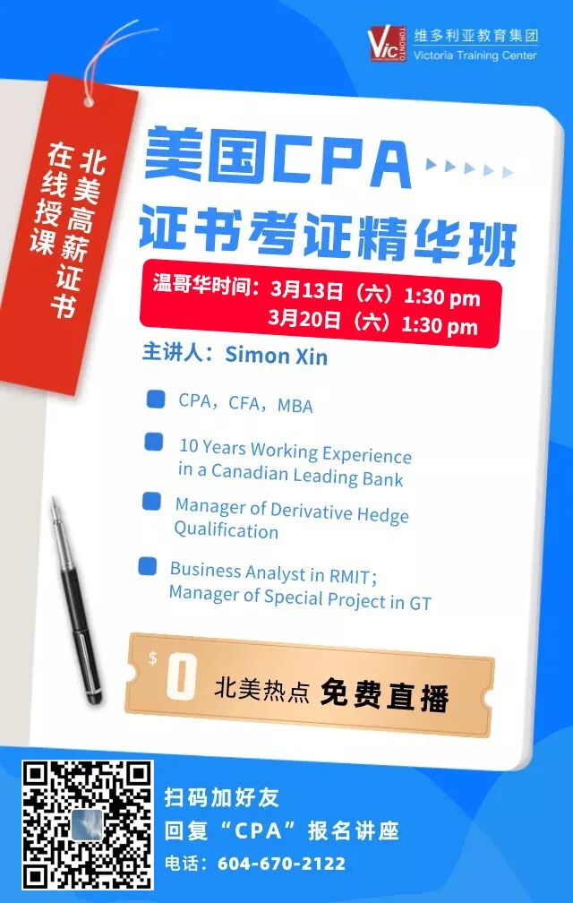 现在,邀请你加入线上“零基础CPA训练营”公开课,由十年加国顶级银行经验Simon Xin老师,为你提供系统专业的CPA讲解,轻松快速地帮你的成绩实现质的提升!