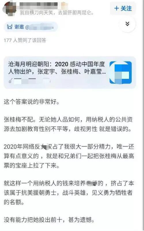 还有博主说:“张桂梅不配。这是歧视男性。应该把张桂梅从宝座上拉下来。”