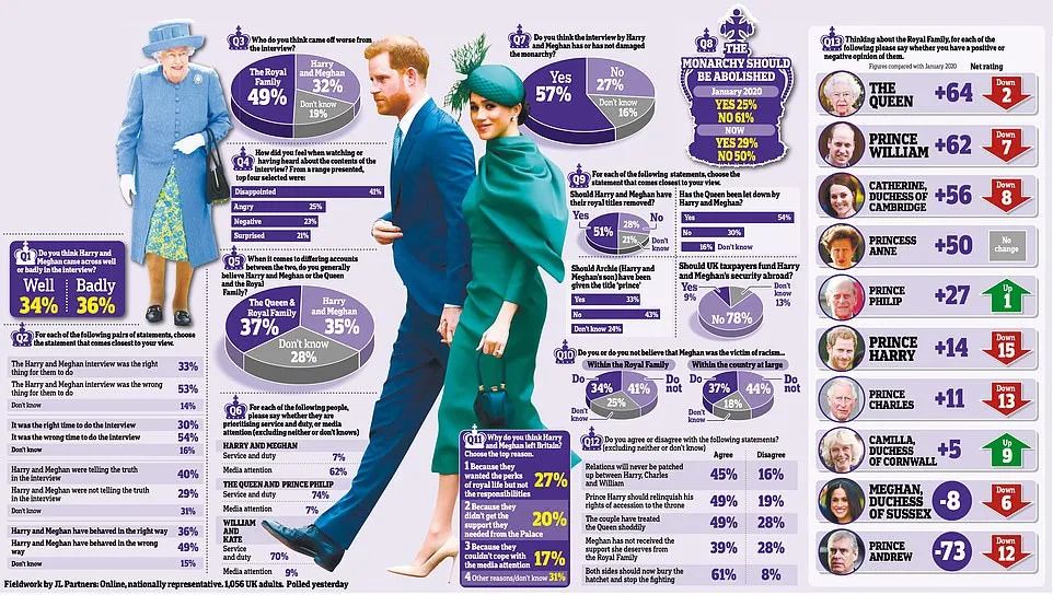 英国《每日邮报》在奥普拉访谈播出后做了一个民调,结果显示大部分英国人都认为哈里和梅根令王室蒙羞,他们为了媒体曝光度,而无视了自己作为王室成员的责任,和维护家人的义务。有趣的是,根据这个调查,英国人最讨厌的王室成员是安德鲁王子,而对这一位奸淫幼女的强奸犯,王室一直很维护。