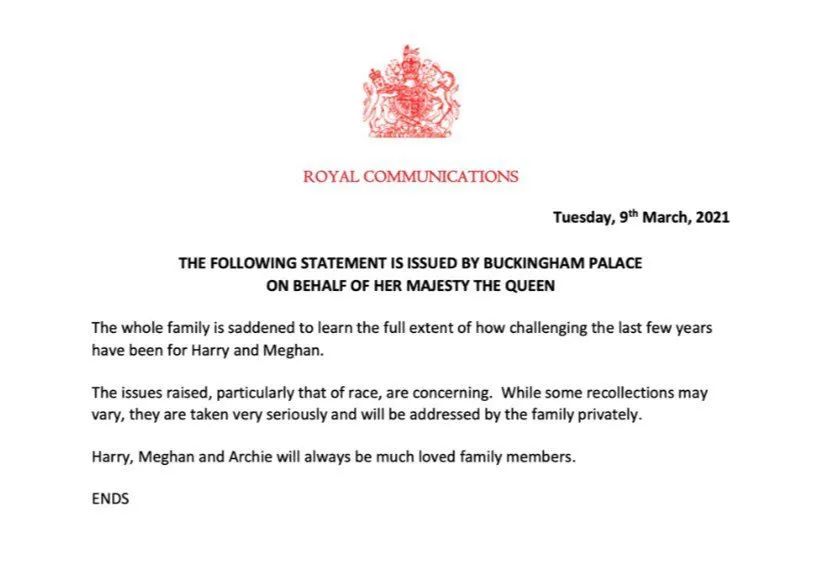 但是总这么耗着不是办法,王室的沉默反而会被认为是对指控的默认。于是3月9日,白金汉宫终于打破连续两天的沉默,终于发出了这份声明。