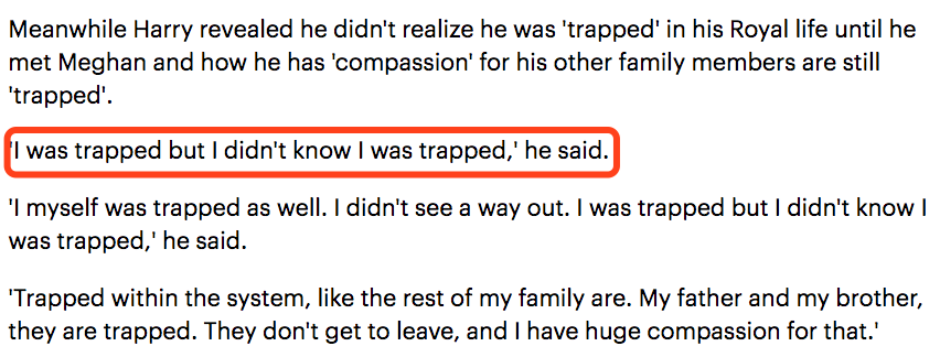 而且诡异的是,哈里在访谈中这样说:“直到遇见梅根,我才知道自己被困住了。”
