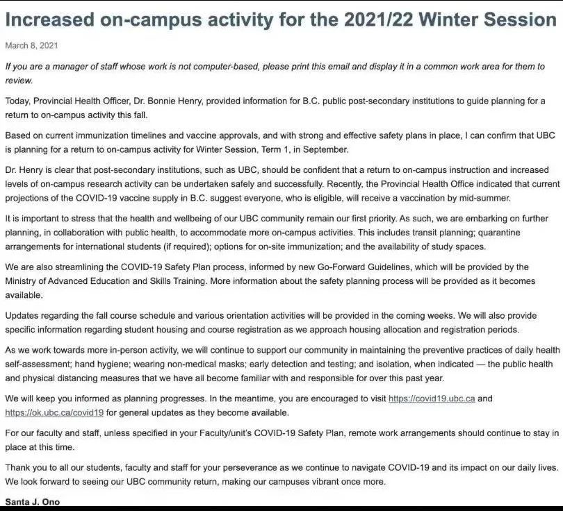 【加拿大乐活网lahoo.ca 亚瑟综述】3月8日,UBC大学给学生发了封邮件,通知所有学生9月份要返回学校上课,这标志着大温各大学校将陆续都会在9月返校上课。