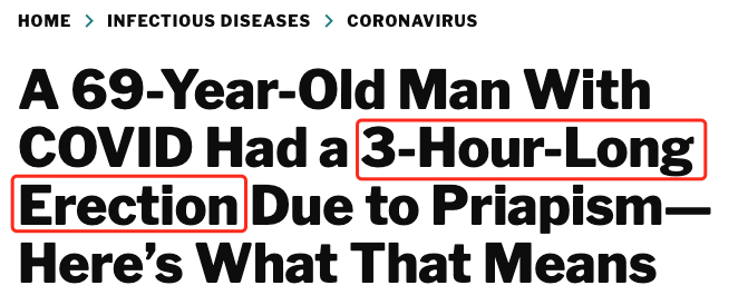 Global News3月10日报道了一种罕见的新冠症状。一名69岁的美国患者在2020年不幸染疫时,他的丁(yin)丁(jing)异常雄(bo)起(qi)长达三小时!