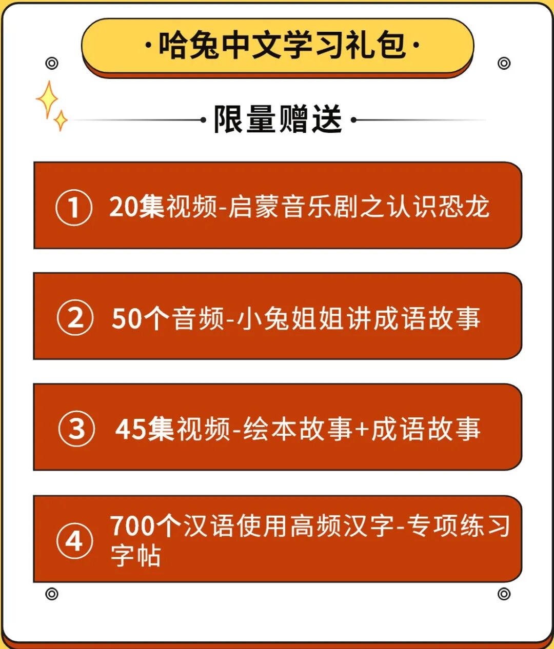 在学习中文成为大势所趋的情况下,【哈兔中文】特意为美洲想学中文的小朋友,准备了丰富的免费中文课程。