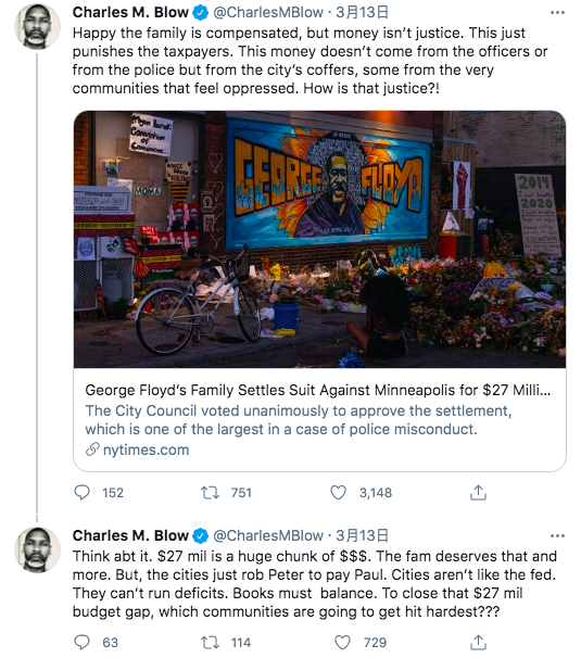 3月12日晚,他在推特上愤愤地写下了这样一段话:“很高兴弗洛伊德的家人得到了补偿,但金钱并不等于正义。这么做只是惩罚纳税人…这笔钱并非来自警官或警察局,而是来自城市的金库,其中一些来自那些感到受压迫的社区。这算哪门子的正义?!”