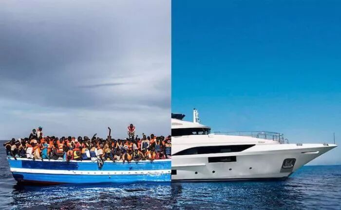 右边是豪华的白色游艇,左边则是慢慢一船等待救援的难民,伸出的双手显得更加无助悲凉。