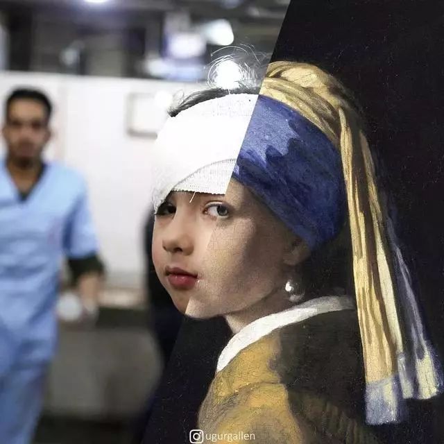 这张无疑是让人心碎的照片,缠着绷带的女孩与画中的少女都有着美丽的眼睛,但前者的目光中散发着不属于年龄的忧郁和冷静。