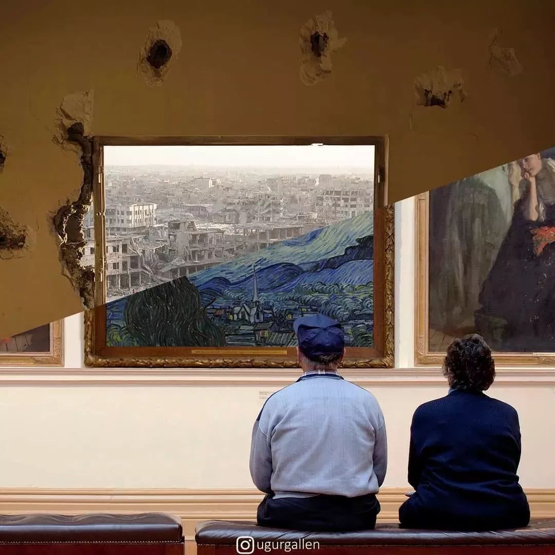 坐在美术馆中看着梵高风景画的夫妇,相对的另一边,满是弹孔的墙壁外,却是无法直视的满目疮痍。