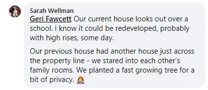 尤其是网友Sarah Wellman的一句“你不拥有你看到的风景”(You don’t own your view)激起了更多讨论。Sarah居住在满地宝(Port Moody),她说现在居住的房子俯瞰一所学校,但她预感到有一天这块地方会有开发商来重建,很可能是高层公寓,如果她很介意新建的房子挡住了她的风景,她会选择搬家。