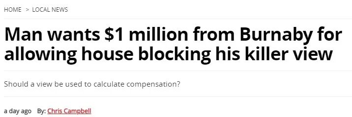 近日,一户居住在北本拿比Capitol Hill地区西坡上的业主Wayne将本拿比市府告上BC省高等法院(Supreme Court of British Columbia),并索赔$100万!真的是狮子大开口!
