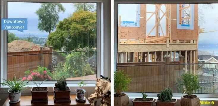 原因很简单,与他家后院相邻的在建独立屋,挡住了他的风景!原本从他家可以俯瞰温哥华市中心和Burrard内湾美丽的风景,随着新房子的建起,现在完全看不到了!而这栋在建的独立屋,得到本拿比市府的批准。