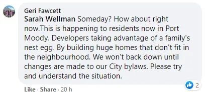 但网友Geri Fawcett显然不同意她的意见。Geri说,开发商买地重建高楼影响周边居民的事情正在满地宝上演,“开发商正在占一个家庭积蓄的便宜,通过建造与社区不相称的巨型房屋。我们不会后退,直到市府法规改变。”