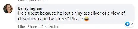 网友 Bailey Ingram居住在同一社区,她认为Wayne的要求非常荒谬,“他不安仅仅因为失去了一小片市中心的风景和两颗树?拜托~”
