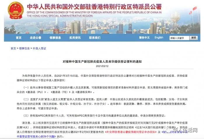 自今日(2021年3月15日)起,中国外交部驻香港特别行政区特派员公署将对已经接种中国生产的新冠肺炎疫苗,并持疫苗接种证明材料的以下签证申请人提供便利: