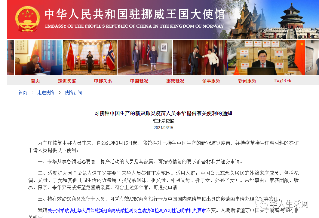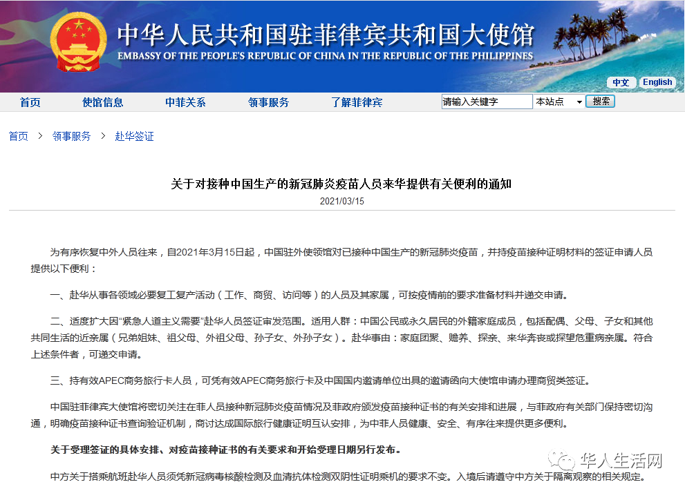 即已经接种中国生产的新冠肺炎疫苗的申请者,将获得签证便利,递交申请时不再需要核酸阴性证明。